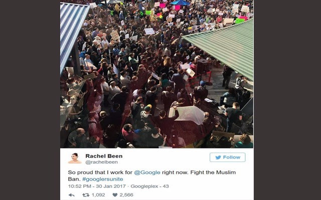 نظم العاملون في غوغل من ثمانية فروع اليوم وقفة احتجاجية على حظر الهجرة من طرف الرئيس الأمريكي ترامب. غوغل، وشركات التكنولوجيا بشكل عام، وقفوا مع البلدان الأشد تأثرا و مع حاملي التأشيرات الحالية.