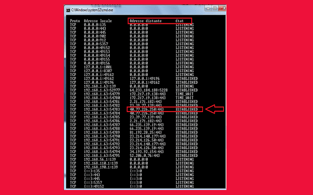 3 - تظهر نافذة على شكل جدول بها عناوين IP المتصلة مع حاسوبك، يلزمك التركيز على état في حالة وجدتها LISTENING فأنت في أمان و لا يتم اي تبادل للمعلومات في الخلفية.
